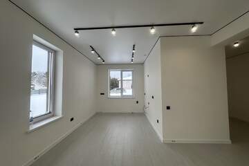 Произведен монтаж натяжных потолков, без установки люстр и скрытых гардин.